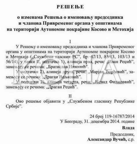 Në ditën e fundit të vitit 2014 kryeministri serb, Aleksandar Vuçiq ka marrë vendim për ndërrimin e disa kryetarëve të komunave ilegale, që në vendim quhen “organet e përkohshme në Krahinën Autonome të Kosovës dhe Metohisë”, transmeton Koha.net.